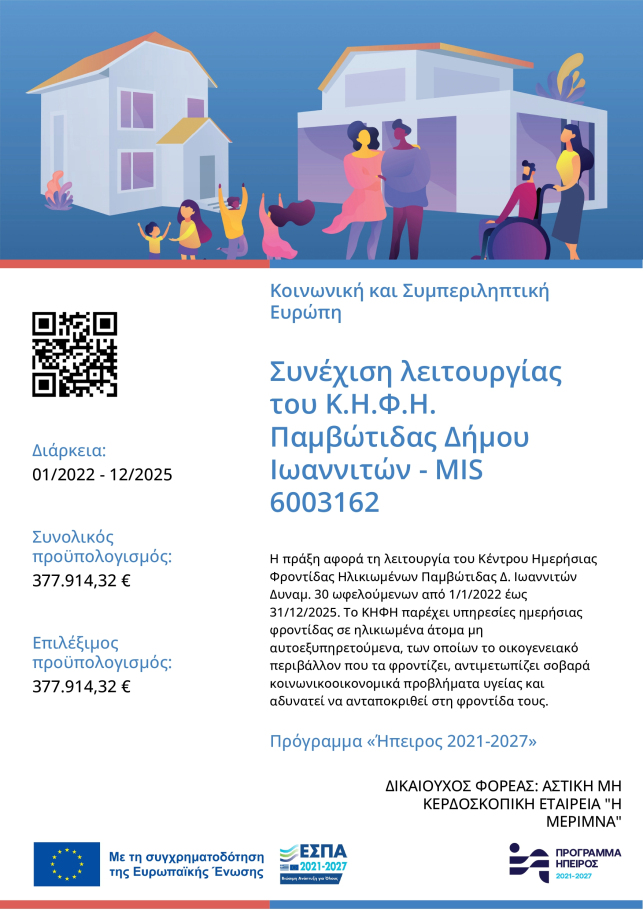 Στο πλαίσιο ένταξης στο Επιχειρησιακό Πρόγραμμα «Ήπειρος 2021-2027» της Πράξης «Συνέχιση λειτουργίας του Κέντρου Ημερήσιας Φροντίδας Ηλικιωμένων (Κ.Η.Φ.Η.) Παμβώτιδας Δήμου Ιωαννιτών» με κωδικό ΟΠΣ 6003162, η δικαιούχος Α.Μ.Κ.Ε. «Η ΜΕΡΙΜΝΑ», δέχεται αιτήσεις συμμετοχής για πλήρωση κενών θέσεων ωφελουμένων στη δομή «Κέντρο Ημερήσιας Φροντίδας Ηλικιωμένων (Κ.Η.Φ.Η.) Παμβώτιδας του Δήμου Ιωαννιτών».